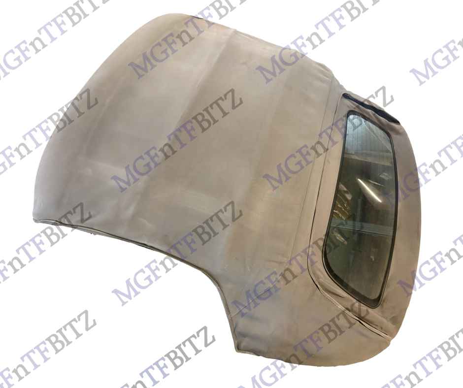 Grey Hood – Heated Glass Screen. A rare pale grey soft top convertible roof with heated glass rear screen, heating connectors are all intact. There are no holes in the skin and it comes complete with frame.  A genuine MG Rover part in good used condition. The Hood has been cleaned but would benefit from another clean and waterproofing.