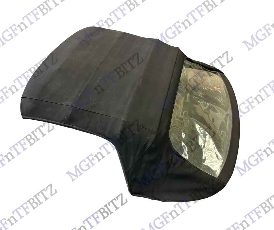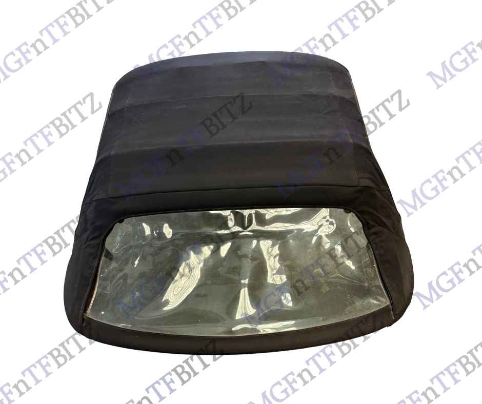 MK1 Black Hood – Plastic Screen. A lovely condition genuine complete MK1 black soft top convertible roof with undamaged clear plastic rear screen.  To confirm this used roof has no holes or splits and comes complete with frame, ready for an easy fit to your car. A genuine MG Rover part in good used condition. A great hood for those who want to keep their MK1 original.